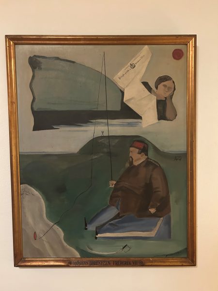 ”Der er uden tvivl tale om Mogens Lorentzen-maleriet. Motivet, Grevinde Danner, der ligger og læser avis, mens Frederik d. 7. fisker, er identisk med de sort-hvid-fotos, vi har af værket. Størrelsen på 80x100cm passer også – det samme gør materialet olie på lærred. Derudover er det signeret og har titlen Frederik VII monteret på rammen.”