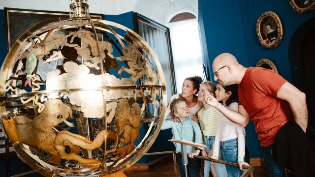 Explore the museum illuminated by chandeliers, candlelight, and flashlights.