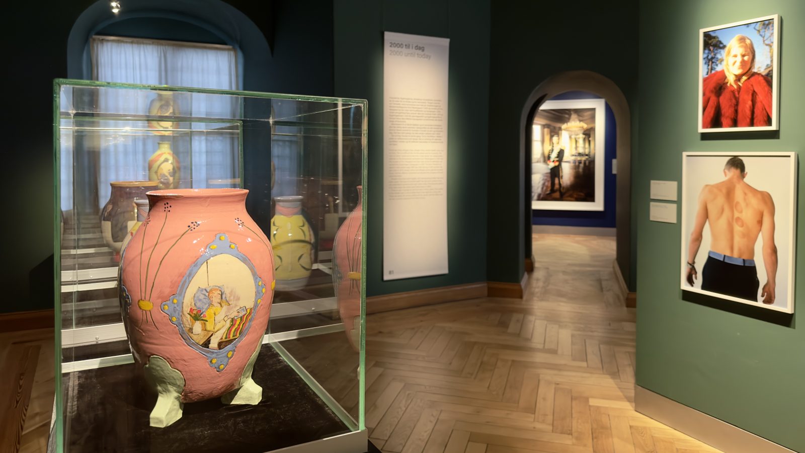 Derunder Niels Pugholms Coronakrukker med et glimt af Marco Grobs portræt af Frederik 10. og Petra Kleis’ portrætter af Sofie Linde og Viktor Axelsen.