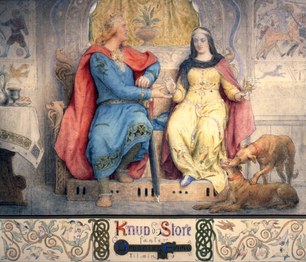 Herunder ser du et udsnit fra Lorenz Frølichs fantastiske frise i Prinsessefløjen på Frederiksborg, hvor Knud den Store og Emma bliver gift i 1017.