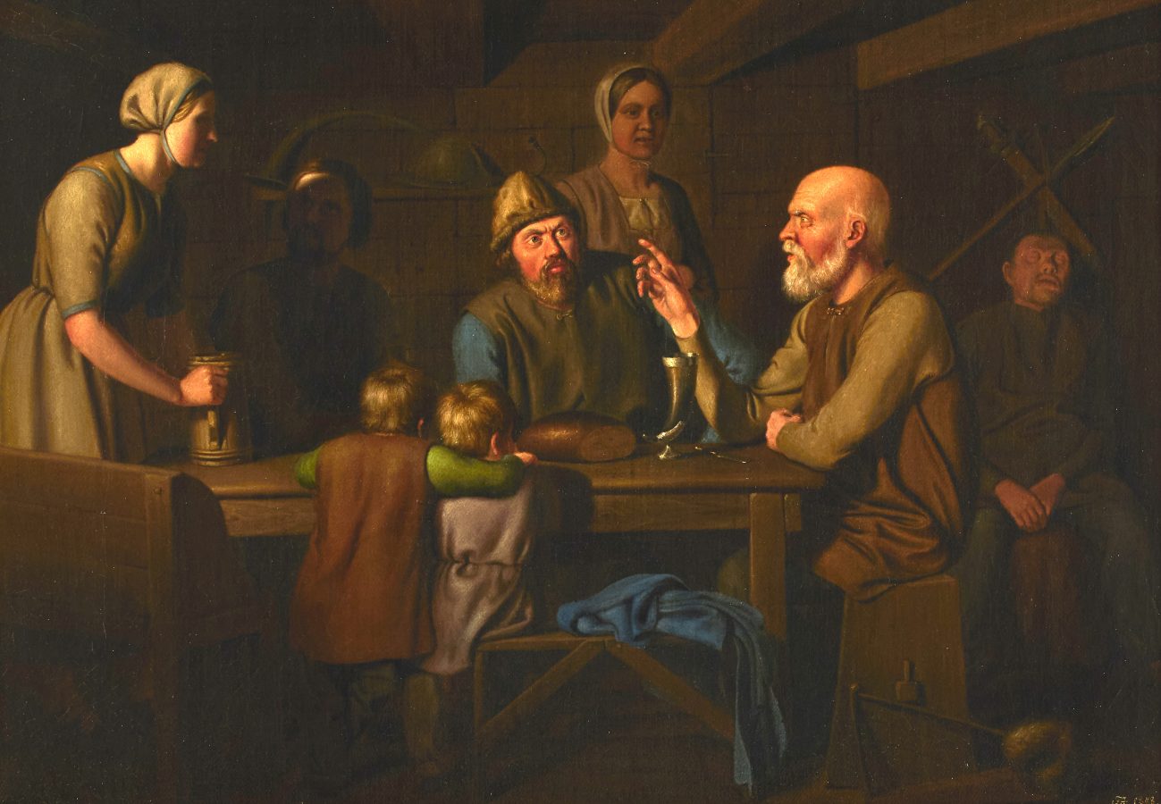 Nederst et maleri i Frederiksborgs samling fra 1848 af Fritz Jürgensen, der ellers var mest kendt som satiretegner. Det viser en “oldnordisk scene”, hvor en gammel, hvidskægget skjald har sat harpen fra sig og fortæller sagn og digte for lidt skræmte børn og opmærksomme voksne.