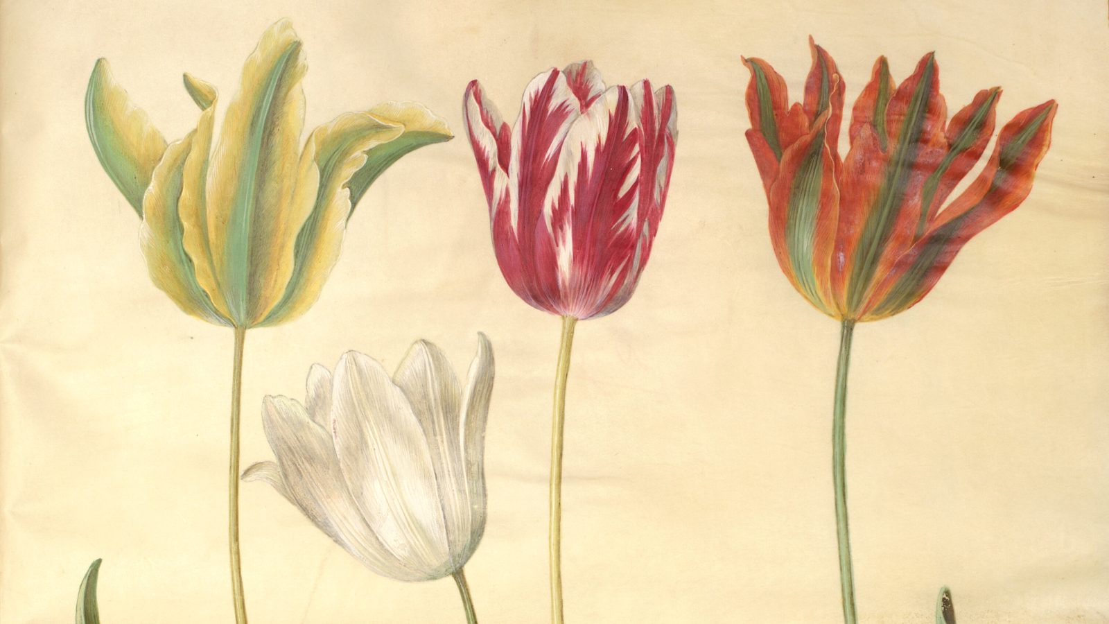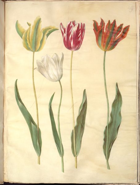 De fine tulipaner er malet af Hans Simon Holtzbecker til det store danske planteatlas med mere end 1200 planter, “Gottorfer Codex” fra 1649-1659.