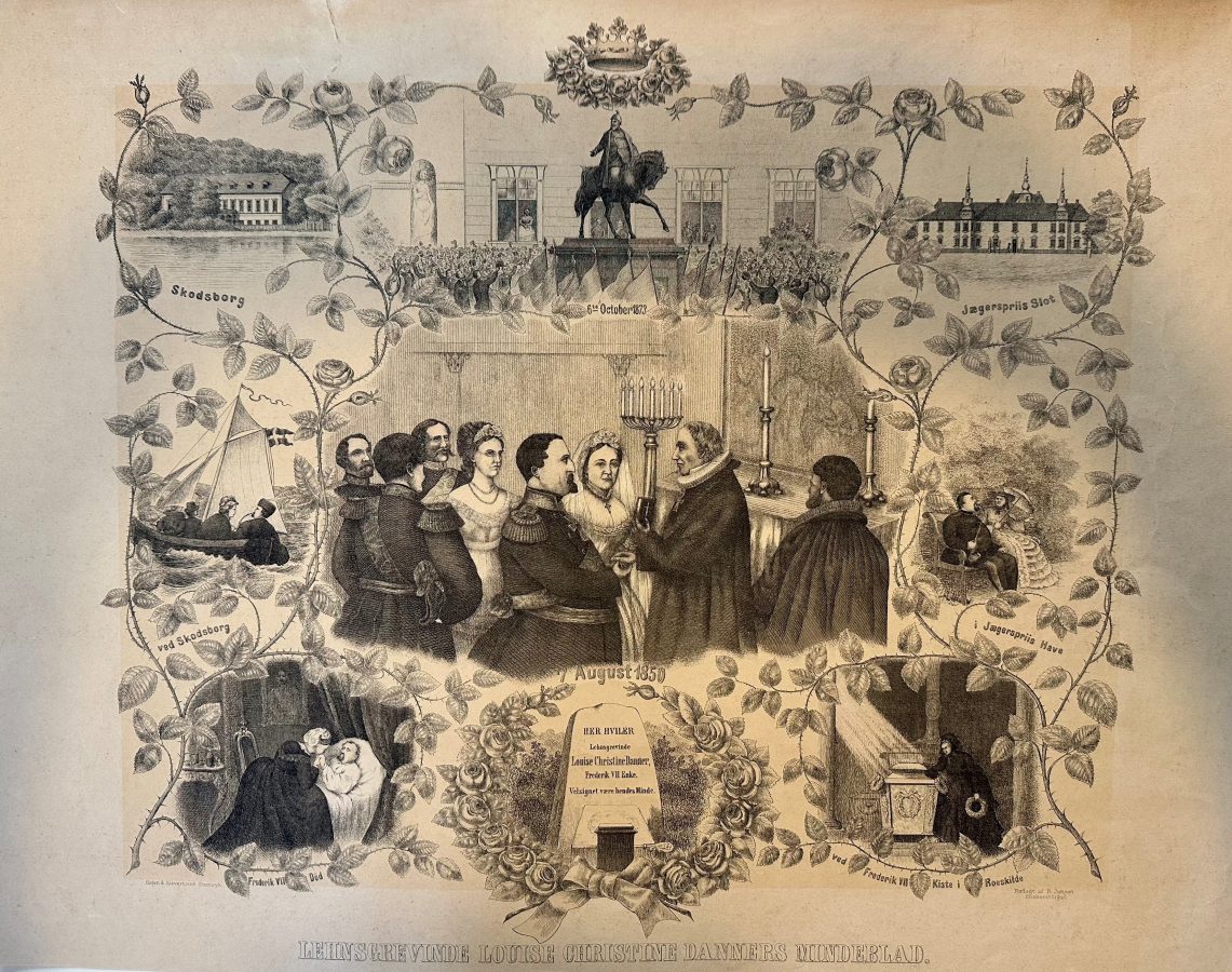 Herunder: Ved Grevinde Danners død i 1874 udkom dette mindeblad over hendes samliv med Frederik 7. – fra brylluppet i 1850 over kongens død i 1863 til opstillingen af rytterstatuen på Christiansborg Slotsplads i 1873, hvor grevinden ikke er inviteret med til den festlige højtidelighed på slotspladsen, men ydmygt må se til fra et vindue på slottet.