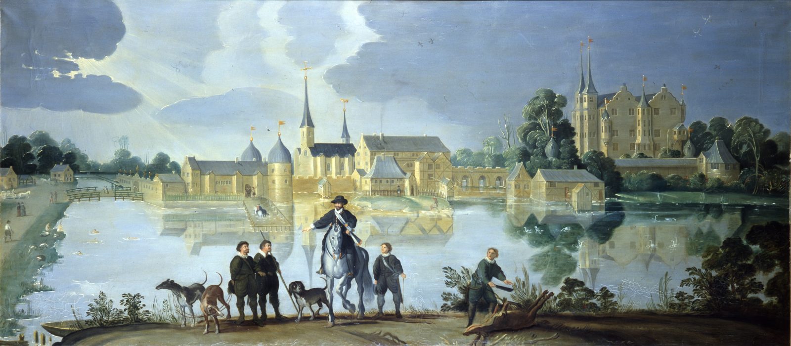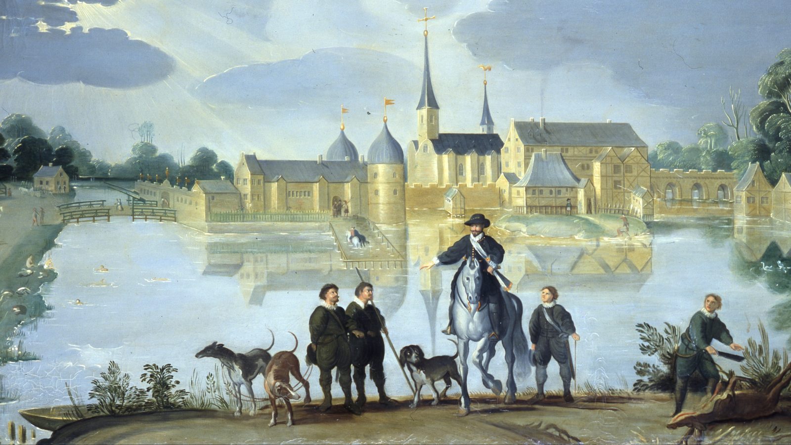 Frederik 2. ses i forgrunden på en smuk, hvid hest. I baggrunden to heste i et indhegnet bassin i slotssøen ved den del af Frederik 2.s slot, som står endnu med de smukke, runde tårne.