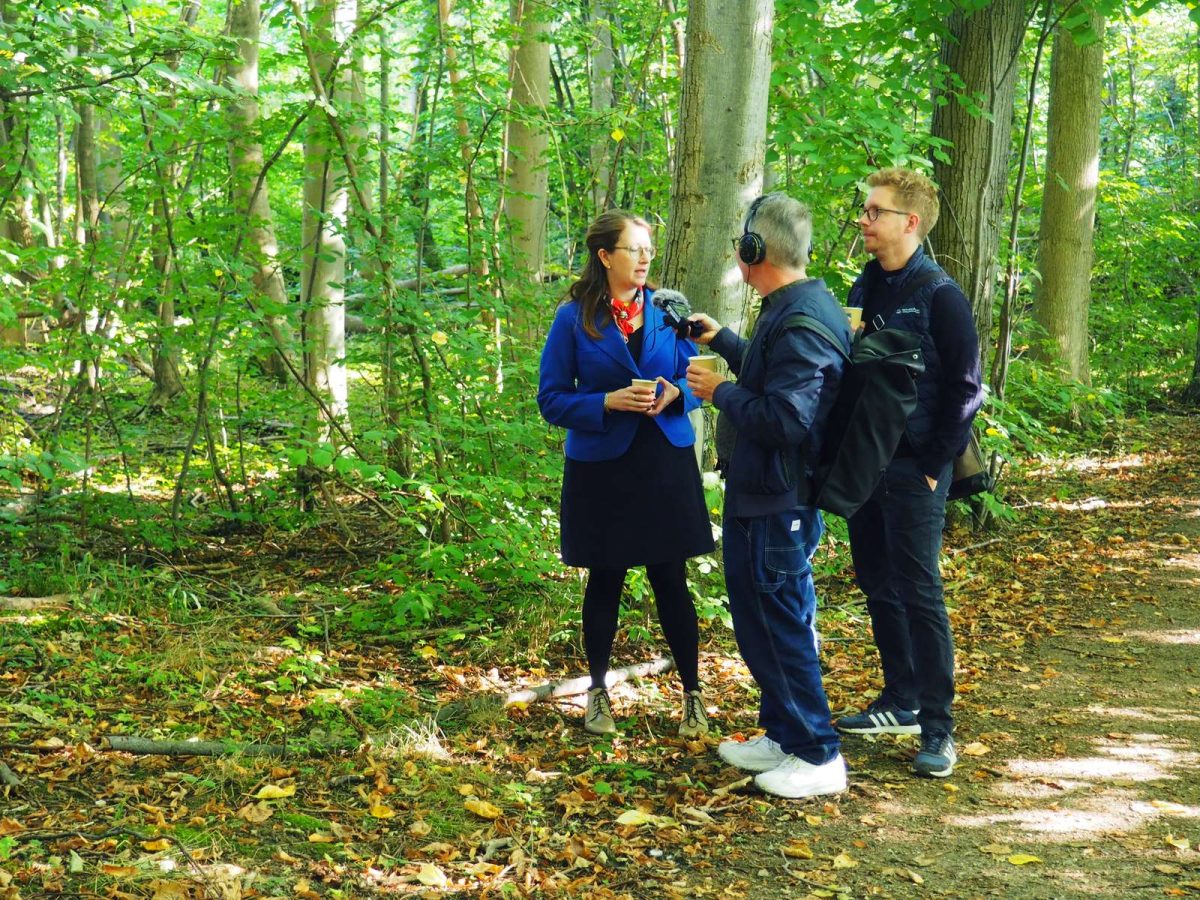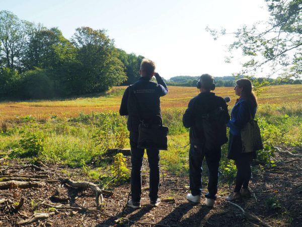Nederst et par billeder fra podcast-optagelsen i eng og skov (foto: Linnea Molbech Sabri).