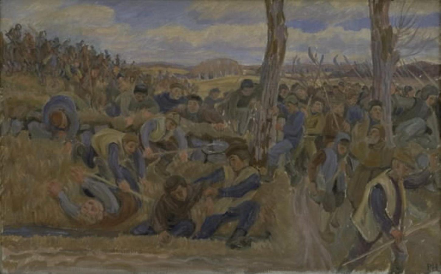 I magasinerne på Statens Museum for Kunst har de Peter Hansens maleri fra 1916-20 af de gæve bønder og “knejte”, som håbede, at de ville sejre i Grevens Fejde. SMK Open.
