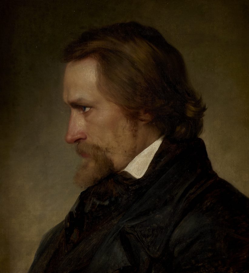 Nederst hendes portræt af ægtefællen, billedhuggeren Jens Adolf Jerichau. Maleriet har tilhørt H. C. Andersen før det kom til Frederiksborg.