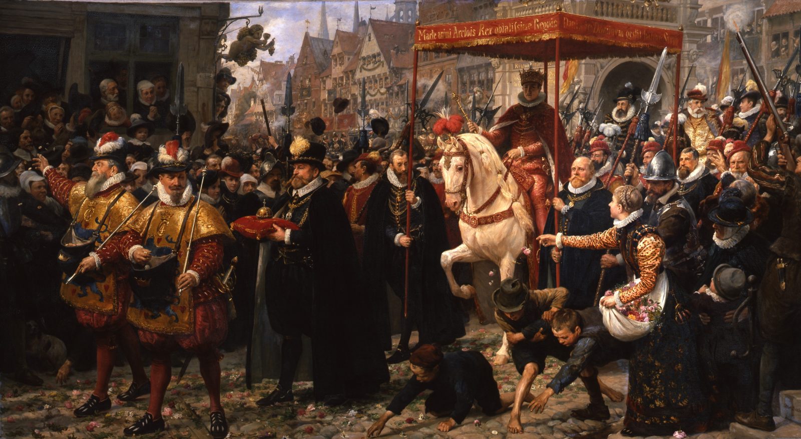 På Otto Baches maleri fra 1887 – et af de store pragtstykker på Frederiksborg – ser vi den unge Christian 4. ride med krone og scepter gennem byen efter kroningen i 1596.