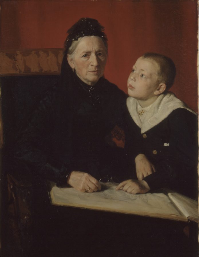 August Jerndorff har malet Laura Jacobsen med barnebarnet Alf i 1889. Hun bærer enkeslør, da bryggeren er død to år tidligere. Barnebarnet Alf dør nogle måneder senere af skarlagensfeber, kun ni år gammel. Det smukke portræt kan ses i stue 68 på Frederiksborg.