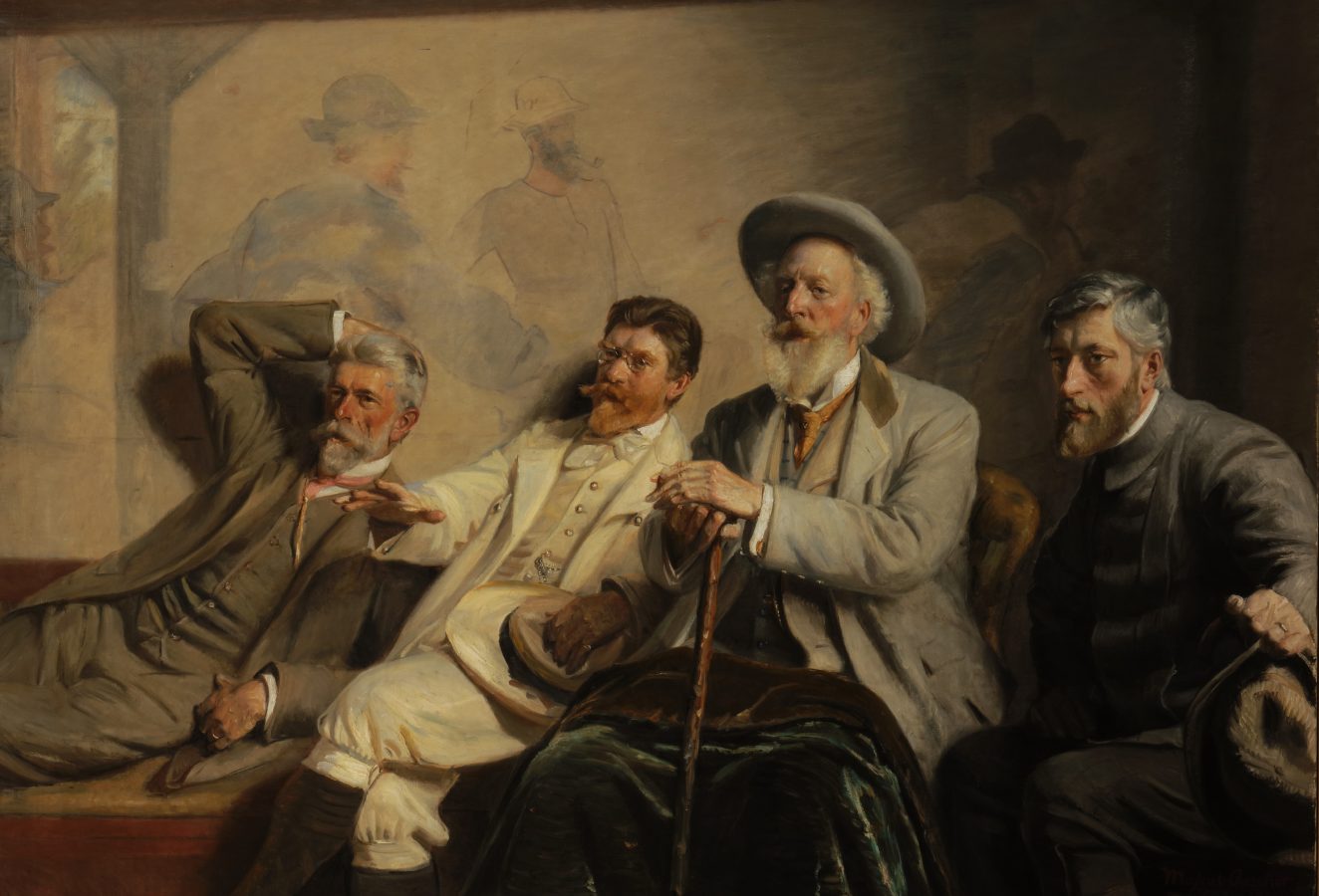 Nederst: Michael Ancher: Kunstdommere (1906). Fra venstre til højre ser vi Tuxen, Krøyer, Drachmann, Willumsen med deres prangende kunstnerskæg. Stue 72.